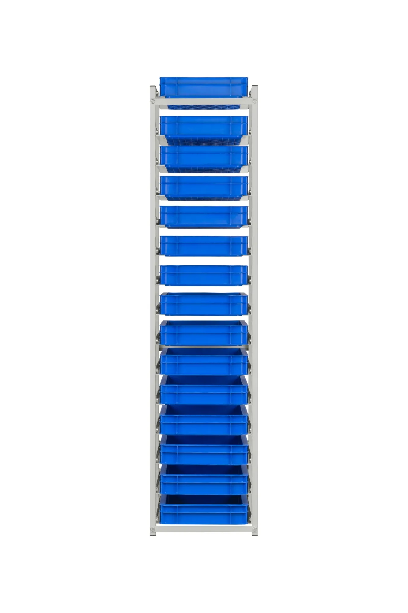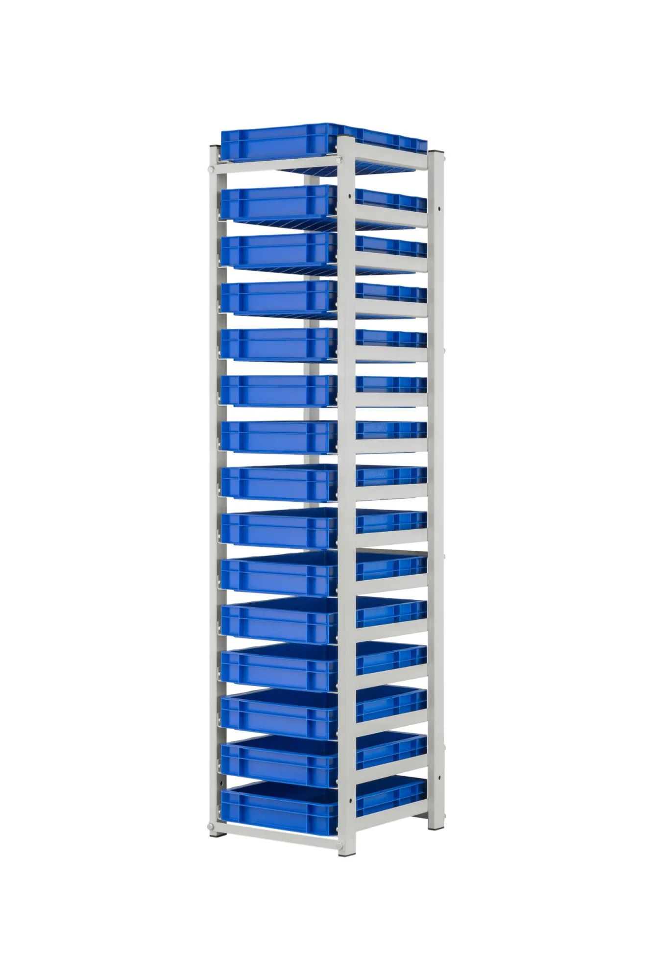 Regał został wyposażony w 15 pojemników o wymiarach 400x300x70 mm, co pozwala na przechowywanie różnorodnych przedmiotów, od drobnych narzędzi po komponenty produkcyjne.
