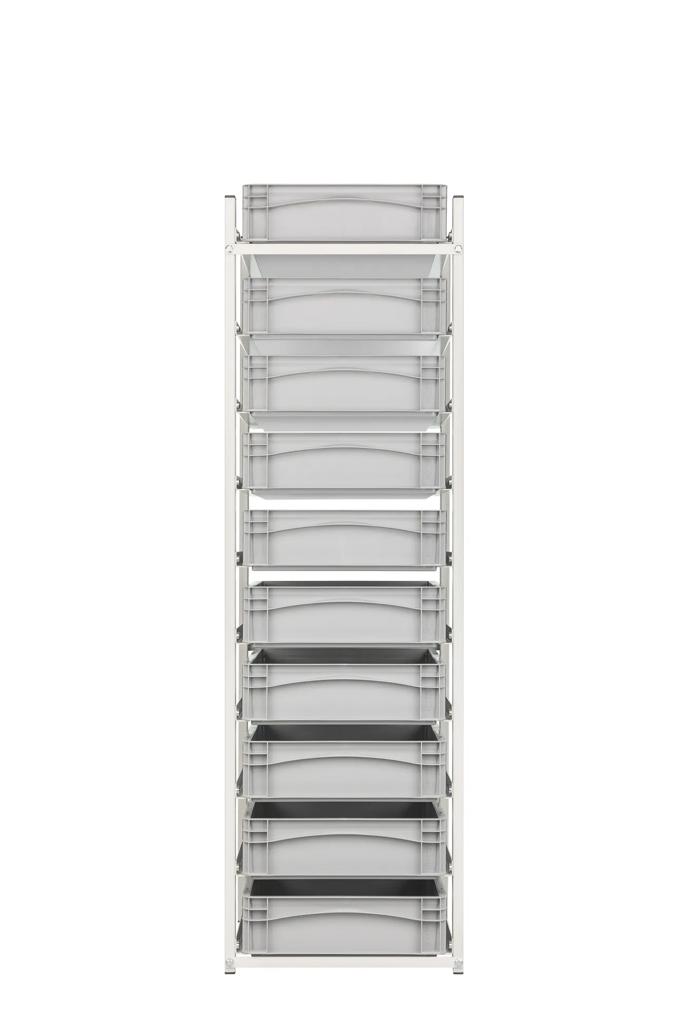 Ten model regału został zaprojektowany z myślą o użytkownikach, którzy potrzebują maksymalnej funkcjonalności w kompaktowej formie. Stalowa konstrukcja regału, malowana proszkowo, zapewnia wyjątkową trwałość i odporność na korozję, a pojemniki 600x400x120 mm z wysokiej jakości tworzywa gwarantują wytrzymałość, lekkość i odporność na czynniki chemiczne.
